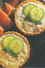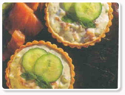 3. Lachsfüllung auf die Ragoutförmchen löffeln, die Oberfläche glatt streichen und die Törtchen mit Gurkenscheiben und