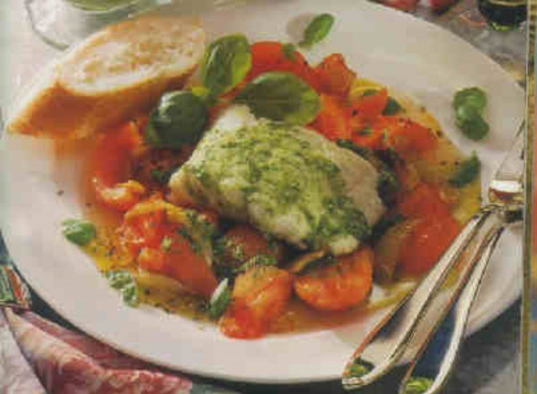 vorgewärmte Teller geben, den Fisch darauf setzen und mit dem Pesto servieren.