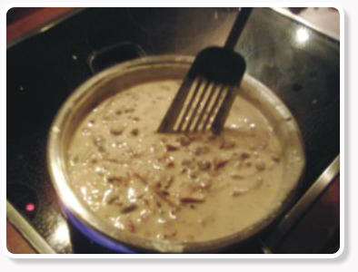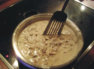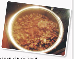 2. Mehl im heißen Bratfett anschwitzen. Wein und Brühe unter Rühren dazugießen. Kurz aufkochen
