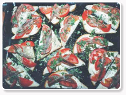 Jede Brotscheibe mit 1 Scheibe Mozzarella, einigen Tomatenstreifchen und 1-2 Sardellenstreifen belegen.