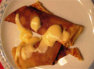 Crêpes in V-Form auf die Teller legen und die Vanillesauce in diese V-Form gießen.