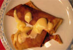 Crepes mit Mousse au Chocolat gefüllt, daran eine Vanillesauce.