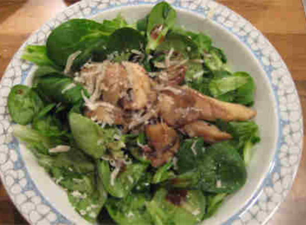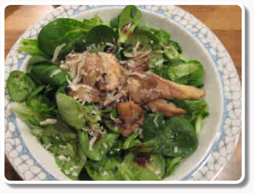 Und so ist dann unsere Gemeinschaftsproduktion Feldsalat mit Pilzen und Parmesan zustande gekommen. Man kann es gar nicht