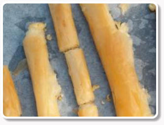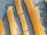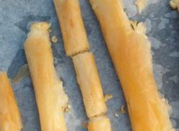 ganzen Teig auf- nicht zu fest! - und legt die Teigrollen auf ein mit Backpapier ausgelegtes Blech. Bei 150 Grad (Umluft 130 Grad,