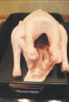 Ist die Bauchhöhle der Gans zugenäht oder mit Zahnstochern verschlossen, kommt das Tier erst mit der Brust nach unten für eine