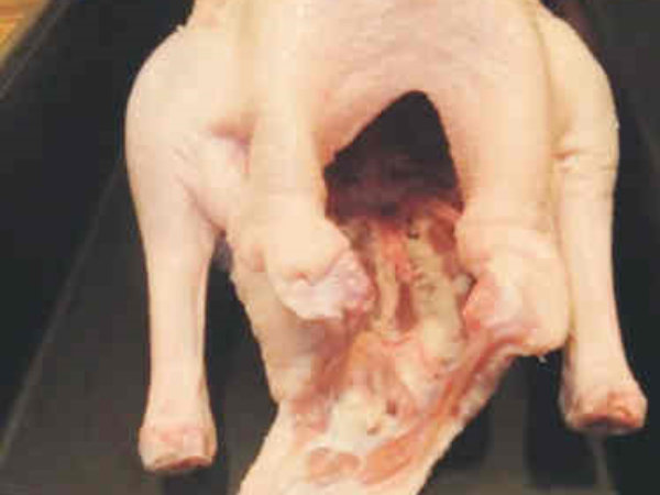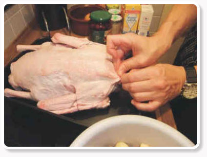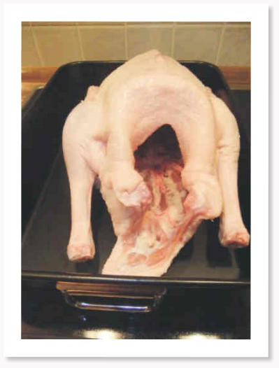 Die Gans innen und außen sorgfältig säubern, Kragen, Flügel und Bürzel abschneiden und die Haut gut