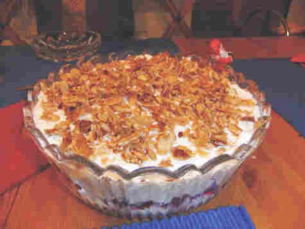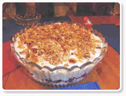 Creme auf die Kirschen geben, die gerösteten Mandelplättchen darüber verteilen.