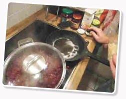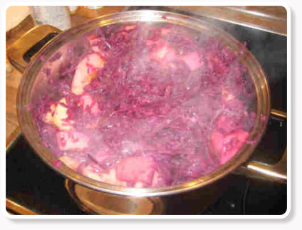 Den Rotkohl hatte ich bereits einen Tag vorher geschnitten, und mit 1,5 Litern Rotwein, 4 Nelken und 2 Lorbeerblättern in einem