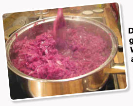 Die Zwiebel in Schmalz mit 1 TL Zucker anschwitzen, den Kohl zufügen und kurz mitschmoren. Mit Wein und Brühe aufgießen.