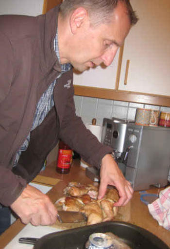 Jetzt stand die Hauptspeise an, "Gegrilltes Huhn auf der Bierdose". Aber, wir hatten kein Huhn, sondern Hähnchen, und diese