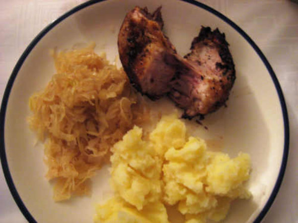 Grill. Da aber derweil das Sauerkraut und der Kartoffelstampf fertig auf den Tellern lagen, haben wir diese zuerst gegessen. Es