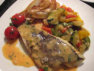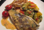 Doradenfilets mit Salz und Pfeffer würzen. Anschließend auf beiden Seiten anbraten. Mediterranes Gemüse dazugeben. Fisch und