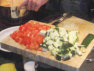 18 Kirschtomaten, 1 grüne Paprika, 1 gelbe Paprika, 1 rote Paprika, 1 ½Fenchelknolle, 16 Scheiben Zucchini a 3mm, Ollvenöl, 2