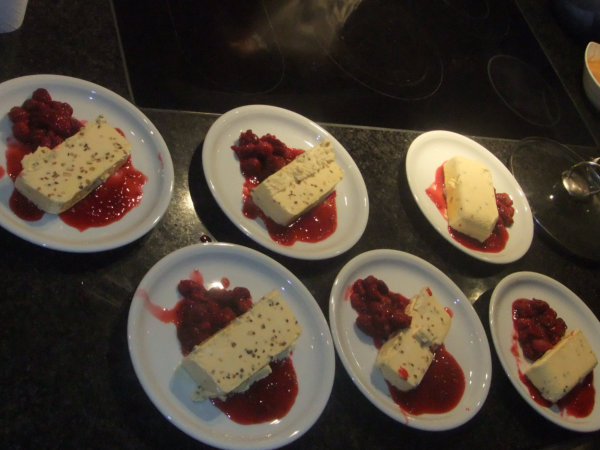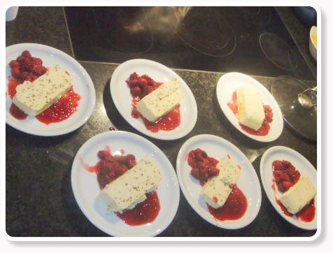 Nachspeise: Mandeleisparfait mit Himbeeren auf Fruchtspiegel.