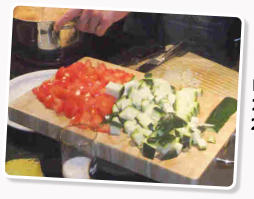 Tomaten vierteln und vom Gehäuse befreien, danach in Streifen schneiden und würfeln.