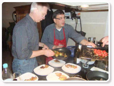 Die heute 5 Bräter nebst Gastkoch liefen zur Höchstleistung auf. Obwohl, vom Inhalt des Rezeptes her, das Hauptgericht nicht