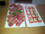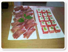 Marinierte Melonenstücke mit Seranoschinken, und Melonenstücke mit Schafskäse Olivenöl und
