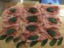 Parmaschinken und einem Salbeiblatt belegen, danach mit einem Zahnstocher feststecken.