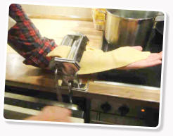 Teigplatten mit dem Aufsatz der Nudelmaschine zu Bandnudeln schneiden.