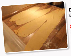 dünn wie möglich ausrollen oder in der Nudelmaschine zu einer dünnen Platte formen. Dazu erst bei