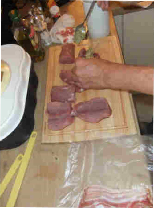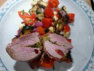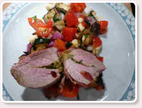 Hauptspeise: Mi t  Mozzarella  gefülltes  S c h w e i n e m e d a i ll o n   vom Grill auf m e d i t err a n e m   G e m ü s e s a l a t