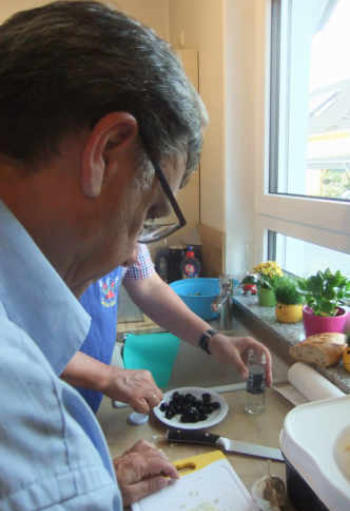 Nachdem wir das Bier dann doch wiedergefunden hatten, nahmen wir zuerst einmal einen tüchtigen Schluck, bevor Matthias und Stefan sich weiterhin um das Verschütten unsers leckeren Kölsch kümmerten. Da wir den Gruss aus der Küche razz fazz in unsere Bäuche geschaufelt hatten, fingen wir dann mit der Zubereitung der ersten Vorspeise an.