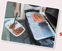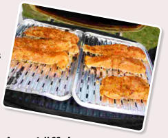 Gruss aus der Küche: Verschiedene Dipps mit Brot Vorspeise 1:       Gefüllte gegrillte Tomaten   Vorspeise 2:               Honig-Senf-Lachs vom Grill auf Wasabigurken Hauptspeise:                   Mi t  Mozzarella  gefülltes  S c h w e i n e m e d a i ll o n  vom Grill auf       m e d i t err a n e m   G e m ü s e s a l a t Nachspeise:                     G e g r i ll t er  Pfirsich  mit  Z i e g e n f r i s c h k ä s e  und  süßem  P e s t o