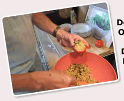 Rezept für 6 Personen 8 mittelgroße Strauchtomaten waschen 140 ml Geflügelfond 80 g Instant Couscous 2 Knoblauchzehen 80 g Feta 50 g schwarze Oliven, ohne Kern Den geschälten Knoblauch fein würfeln, Feta grob zerbröckeln und Oliven hacken. 2 Basilikumzweige 50 ml Olivenöl 50 ml Balsamico bianco Salz, Pfeffer Chili a. d. Gewürzmühle Den Couscous mit heißem Gefluegelfond, Knoblauch, Feta, Oliven, gezupften Basilikumblättern, Olivenöl und Balsamico vermischen und mit Salz, Pfeffer und Chili aus der Gewürzmühle abschmecken. Die Couscous Mischung in die Tomaten füllen, den Deckel wieder auflegen und bei mittlerer Hitze 6 - 8 Minuten grillen. 100 g Rucola 20 ml Olivenöl 20 ml Balsamico bianco Salz, Pfeffer, Zucker Rucola waschen, trockenschleudern und mit Olivenöl,Balsamico, Salz, Pfeffer und Zucker marinieren. Den Rucola auf Teller verteilen und jeweils 2 Tomaten darauf anrichten. Ein sehr leckerer Einstand, ich bin kein grosser Freund von Couscous, aber der war lecker. Und weiter ging es zum nächsten Leckerchen.