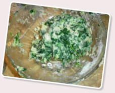 3. den TK Spinat in einem Topf dünsten. Spinat grob hacken, würzen, mit Eigelb und Mehl zu den