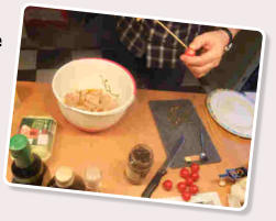 pressen. Das Putenfleisch ca. 3 cm groß würfeln, mit Marinade vermischen und ca. 1 Stunde marinieren.