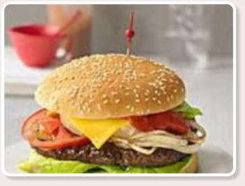 Der fertige Burger besteht aus: Brötchen-Unterseite, Sauce, Salatblatt, Tomate, Zwiebelscheibe, Pattie,
