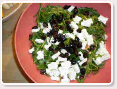 Den Rucola zerkleinern, Oliven in Scheiben schneiden und