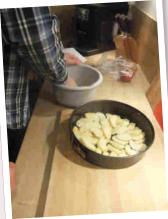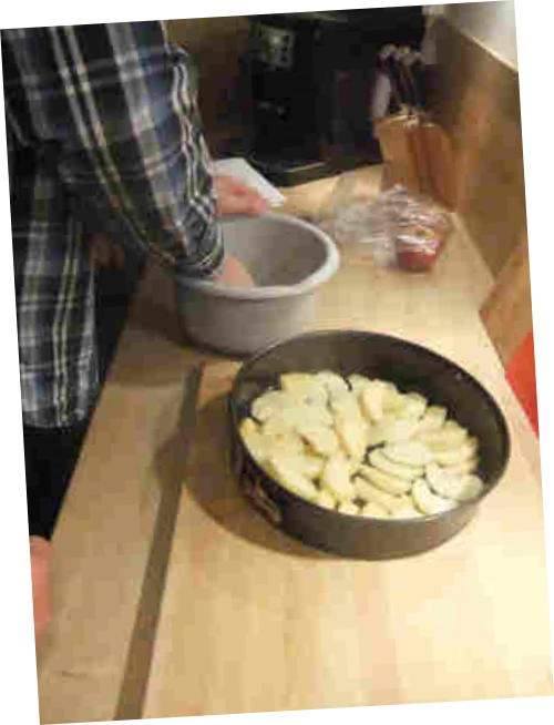 Apfelspalten mit Zitronensaft beträufeln und in eine gefettete Auflaufform geben.