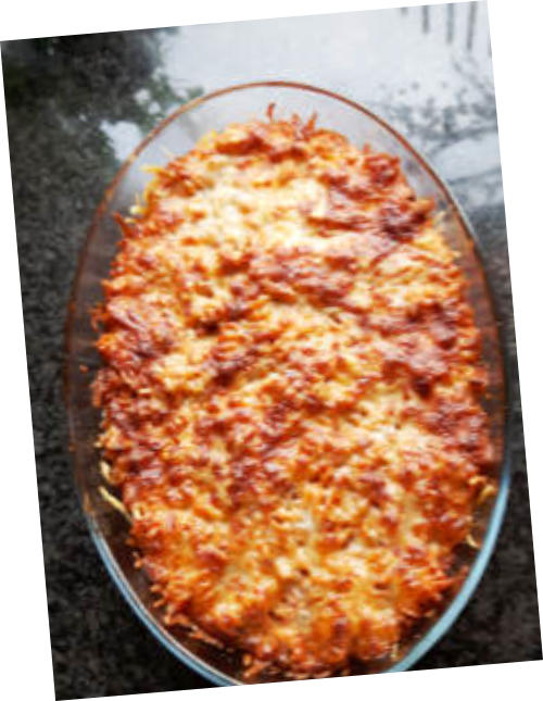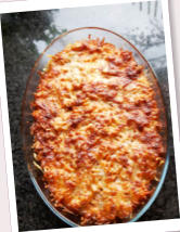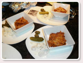 Nudelauflauf, Sahnehering, Oliven und Gewürzgurke