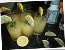 Den Gin Fizz mit einer halben Zitronenscheibe und Rosmarin garnieren und sofort servieren.