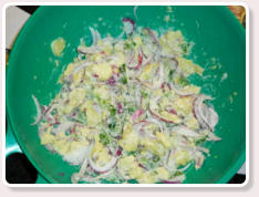 4. Die Kartoffeln abgießen. unter fließendem Wasser abkühlen, abtropfen lassen, trockentupfen und zum Salat geben. Das