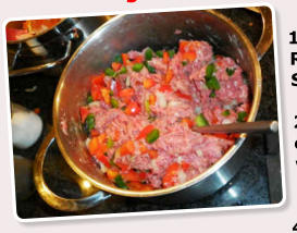 dem Pfannenboden, unter ständigem Umrühren anrösten. Das Hackfleisch dazugeben und braten.