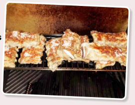 140 °C reduzieren. Die Spareribs mit Gewürz einreiben und auf die Ablage legen. Das Ganze ca. 15 Minuten Räuchern.
