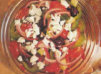 Die Tomaten in kleine Stücke schneiden und in eine mittelgroße Schüssel geben. Die Gurke, die Paprikaschote und die Oliven