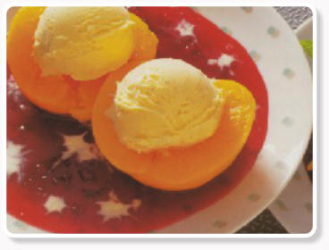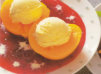 Pfirsichhälften in die Himbeersauce setzen und diese mit je 1 Kugel Pfirsich- oder Vanilleeis füllen.